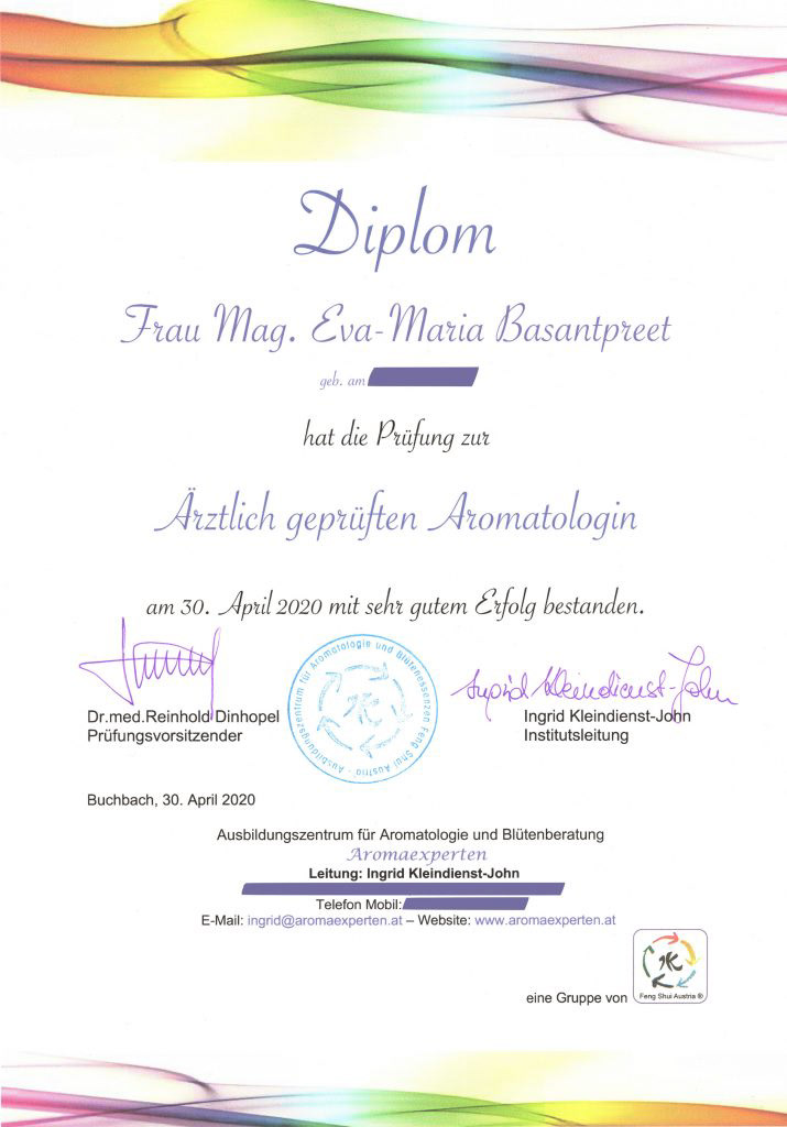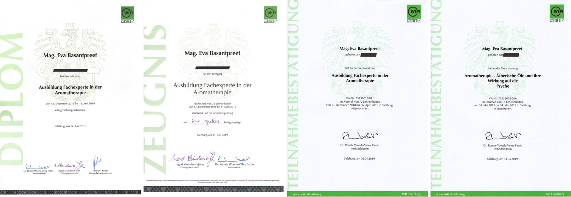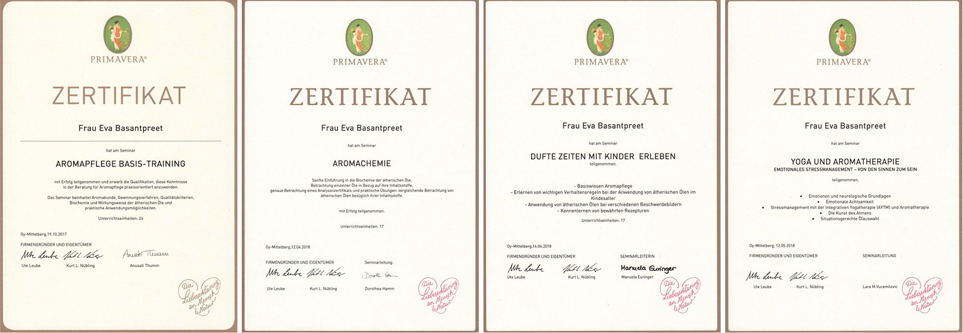 Ich freue mich, die Ausbildung zur ärztlich geprüften Aromatologin bei Ingrid Kleindienst-John/Aromaexperten abgeschlossen zu haben und auf all die weitere Vertiefung und Spezialisierung mit ätherischen Ölen. Vormals Mitglied der VAGA Vereinigung für Aromapflege und gewerbetreibende AromapraktikerInnen