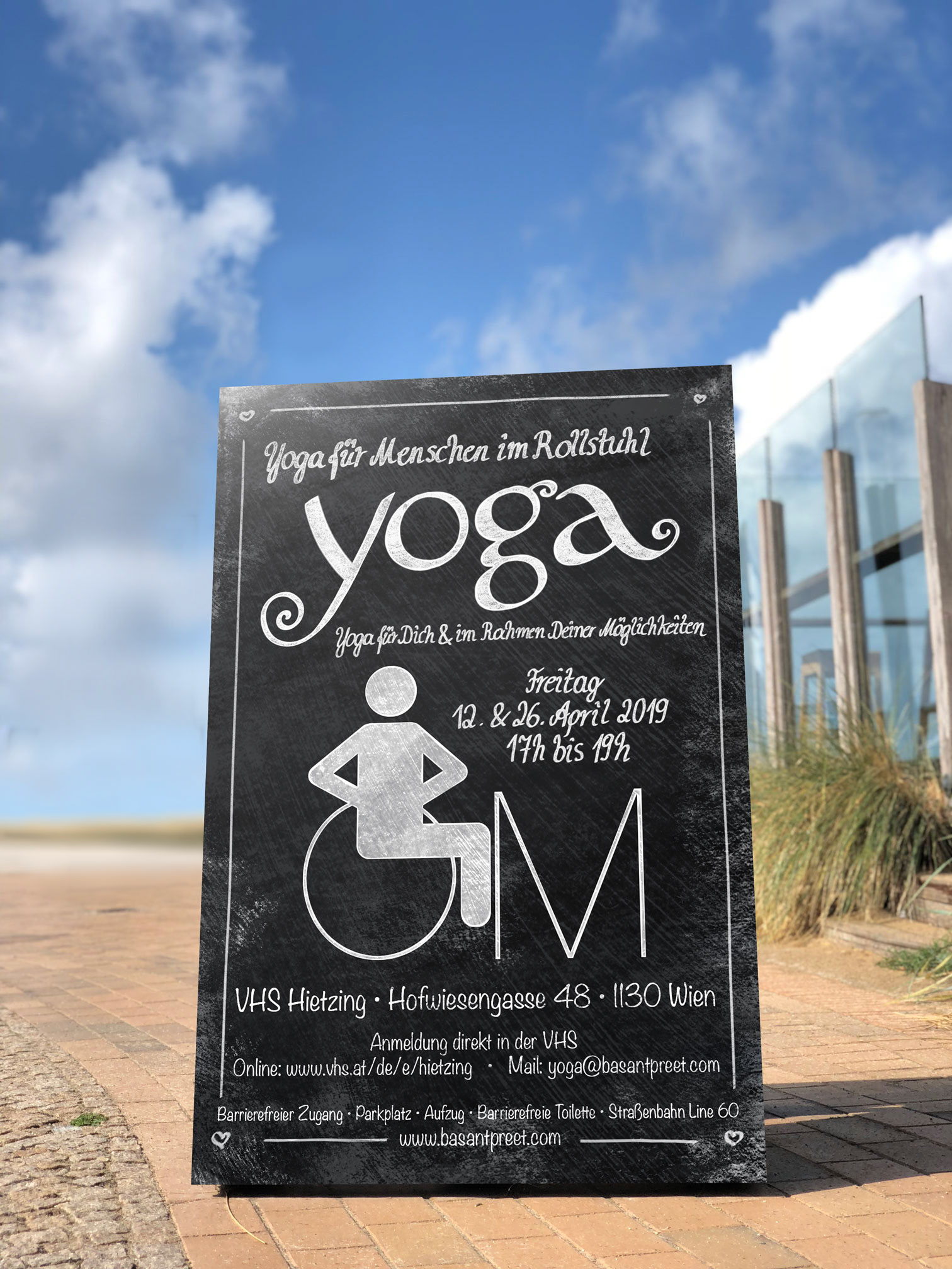 Es war einfach schön für mich, dies teilen zu dürfen. Ich konnte mich zunehmend entspannen, die Unfallgeschichten oder Krankheitsbilder annehmen und mich vor allem auf die Menschen jetzt und hier konzentrieren. Das ist das Wesentliche. Nach der Fortbildung hatte ich die schöne Möglichkeit bei Assistenz24Yoga zu unterrichten. An dieser Stelle ein großes Danke an Valerie und alle Yogis. Es war ein schöner Start und sehr bereichernd. Lustig, wenn der Polster bei der langen Entspannung immer runterrutscht, bis hin zu nicht aufklappbaren Backjacks, aber auch viel einkehrende plötzliche Ruhe, dieses Potential dass sich aufgetan hat, die Offenheit mitzumachen, mein Gewurschtel mit Fußstützen des Rollstuhls und das Singen war gar nicht so schlimm ; ) Auf jeden Fall hat es mich nicht loslassen und ich war seither auf der Suche nach einem barrierefreien Yogaraum. Der wird noch zu mir kommen, aber JETZT ist die großartige Möglichkeit alle barrierefreien Möglichkeiten der VHS Wien auszuschöpfen.