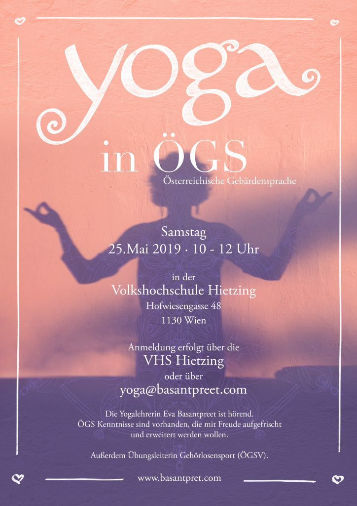 Ich freue mich, erstmals in Zusammenarbeit mit der VHS Hietzing am Samstag, den 25.Mai 2019 von 10:00 bis 12:00 Yoga in Österreichischer Gebärdensprache anzubieten. Eine Anmeldung ist direkt in der VHS Hietzing auch online möglich.